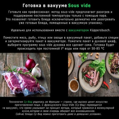 Компактный духовой шкаф с паром Kuppersbusch CBD 6550.0 Объем: 43 литраTFT-дисплей шириной 3,9" с текстовым и графическим полями14 режимов духового шкафа 8 специальных режимов 6 режимов приготовления на пару9 специальных режимов приготовления на пару Более 40 автоматических программ20 избранных программ для сохранения индивидуальных настроекЭлектронная система управления с сенсорными кнопкамиОтображение фактической температуры и рекомендуемойЭлектронный таймер (продолжительность программы, окончание, таймер обратного отсчета) с белыми индикаторамиСъемная дверца с полностью стеклянной внутренней поверхностьюЧетырехслойное остекление дверцыБыстрый разогревЭкономичный режимДемо-режимРежим ожиданияГалогенная подсветкаКонтактный дверной выключатель Катализатор Okoterm очищает воздух во время приготовления, таким образом стенки духового шкафа всегда абсолютно чистые! В отличие от энергоёмкой технологии пиролиза (разрушение частиц грязи путём дожигания) при температуре около 500°С, okotherm® не требует дополнительного времени и дополнительных затрат электроэнергии.Режимы работыВерхний и нижний нагревПодача тепла сверху и снизу обеспечивает равномерное приготовление продуктов, расположенных на одном уровне. Прекрасно подходит для выпечки пирожных и пирогов, например, изделий из дрожжевого теста, чизкейков и т. д.Обдув горячим воздухом с OkothermВентилятор распределяет тепло, генерируемое кольцевым нагревательным элементом, который расположен на задней стенке рабочей камеры. Обеспечиваемая таким образом одинаковая температура по всему объему рабочей камеры гарантирует равномерное приготовление блюд на всех уровнях направляющих, не ухудшая их вкус и запахВерхний и нижний нагрев с обдувом горячим воздухомТепло, генерируемое верхним и нижним нагревательными элементами, равномерно распределяется по объему рабочей камеры с помощью вентилятора. Прекрасно подходит для выпечки и жаренияРежим "пицца" с OkothermСочетание нижнего нагрева и обдува горячим воздухом оптимально подходит для приготовления изделий в виде хрустящей основы с мягкой начинкой. Идеально для пиццы, печенья или выпечки с начинкой из фруктов и паштетовНижний нагревБлагодаря теплу, генерируемому только нижним нагревательным элементом, данный режим прекрасно подходит для приготовления изделий с хрустящей основой или для получения более коричневой корочки снизу. Прекрасно подходит для приготовления очень мягких фруктовых пирогов и для легкого запекания тестовой основы пирогов перед приготовлениемВерхний нагревТепло, генерируемое верхним нагревательным элементом, прекрасно подходит для запекания и подрумянивания блюдECOРежим ECO позволяет уменьшить энергопотребление при приготовлении блюд. Для снижения потребления электроэнергии, духовой шкаф автоматически отключается за несколько минут до окончания приготовления блюда, используя тепло, остающееся в рабочей камере, для доведения блюда до готовностиИнтенсивный обдув горячим воздухом с OkothermВключенный верхний нагревательный элемент, помимо обдува горячим воздухом, используется для создания хрустящей корочки и подрумянивания блюда. Прекрасно подходит для приготовления запеченного картофеля, жарения или запеканияГриль + нижний нагревТепло от нижнего нагревательного элемента и расположенного сверху гр